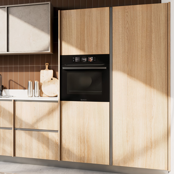L’association des décors combine le clair du Mélèze Passiflora, la douceur du Terra Travertin et la profondeur du brun sépia Atoll. Le contraste avec les profils inox crée un rendu raffiné et contemporain, qui accentue la légèreté et le style de la cuisine.