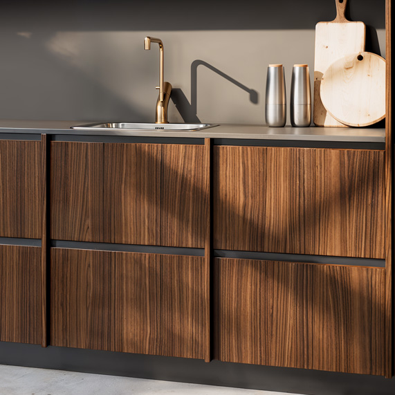 La finition sans poignées confère un rendu épuré et contemporain. Les façades lisses et continues mettent en valeur le contraste des matériaux et offrent une utilisation fluide et intuitive, tout en renforçant l’élégance minimaliste de la cuisine.