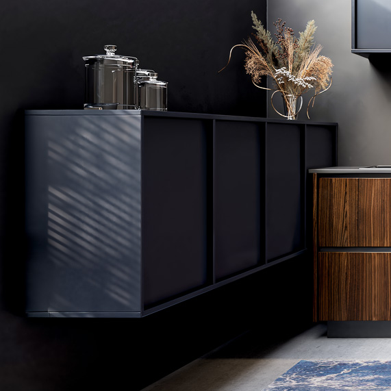 L’association du bois foncé Noyer Villanova et du bleu mat Liscio crée un contraste visuel fort et harmonieux. Les profils noirs et le jeu des volumes soulignent la modernité de l’ensemble, donnant à cette cuisine personnalité et caractère tout en conservant une cohérence esthétique.