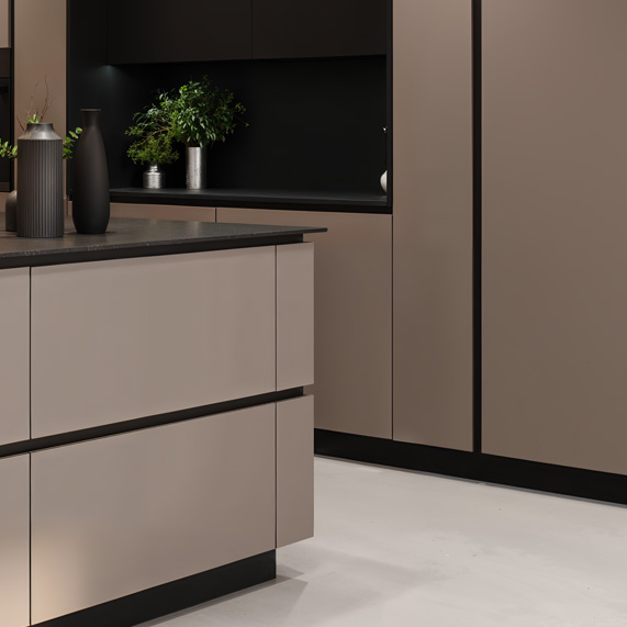 Les profils noirs sans poignées offrent un rendu épuré et moderne, mettant en valeur la fluidité des volumes et la précision des façades. Cette finition minimaliste sublime les couleurs contrastées et renforce l’esthétique contemporaine de la cuisine.