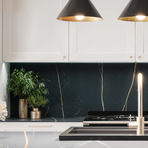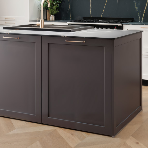 Les façades en surcote basse prolongent jusqu’au sol et cachent le socle, créant une ligne continue et épurée. Chaque détail est travaillé avec soin pour offrir un rendu raffiné et élégant, où la précision des finitions souligne la qualité des matériaux et la modernité de l’architecture de la cuisine.