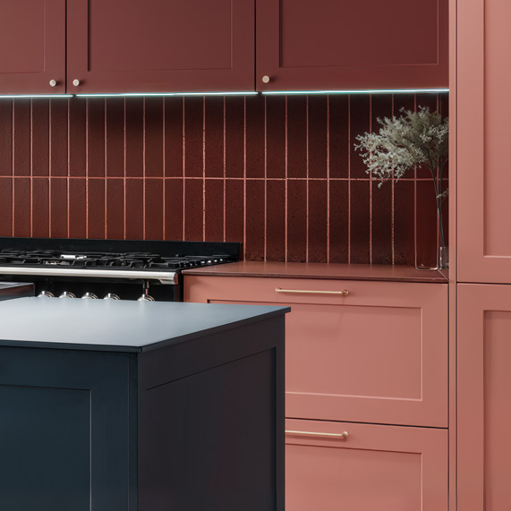 Le mariage du bleu profond, du rose tendre et du rouge intense dynamise la cuisine et met en valeur chaque volume. Cette association de décors osée crée un effet graphique fort et unique, donnant à la cuisine une personnalité affirmée et moderne.