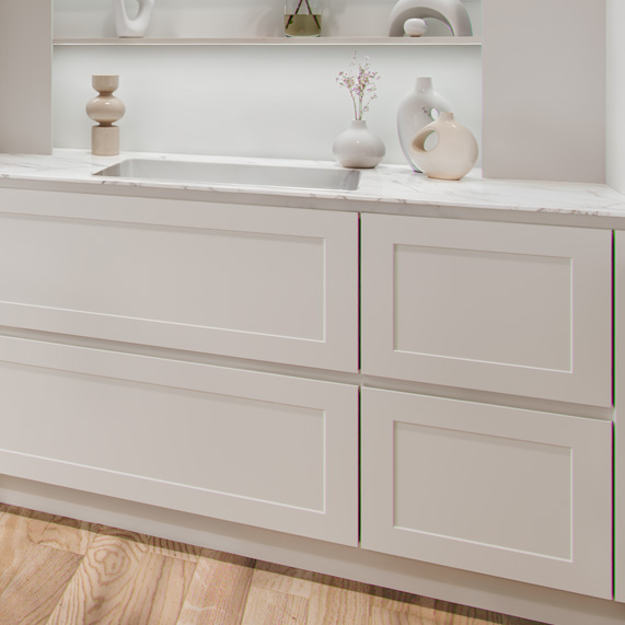 Les portes à cadre blanches soulignent le caractère chaleureux et raffiné de la cuisine. Cette finition classique, revisitée dans un style contemporain, apporte lumière et élégance, tout en structurant les volumes pour un rendu harmonieux et accueillant.