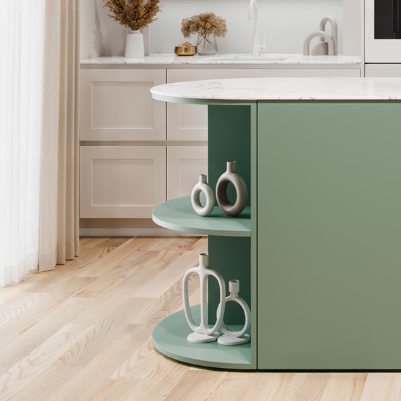 L’îlot central aux terminaux arrondis est complété par des étagères de finition arrondies, qui apportent douceur et continuité aux lignes. Ce détail esthétique transforme l’îlot en un élément fonctionnel et décoratif, idéal pour exposer objets ou accessoires du quotidien.