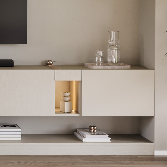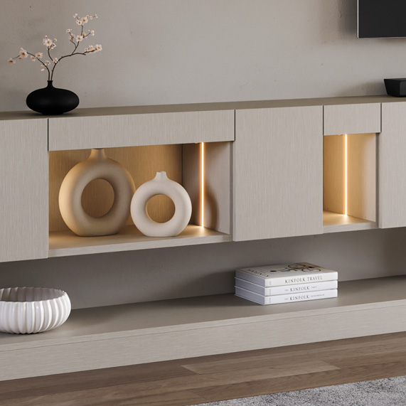 Les niches éclairées mettent en valeur chaque objet et accessoire, apportant lumière et profondeur à l’ensemble tout en renforçant le caractère fonctionnel et décoratif à votre composition.