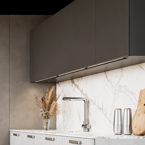 L’éclairage harmonieux intégré sous les meubles hauts et dans l’îlot met en valeur les matériaux et les couleurs, tout en offrant une visibilité optimale pour le plan de travail. Pratique et esthétique, il participe à l’ambiance chaleureuse et contemporaine de la cuisine.
