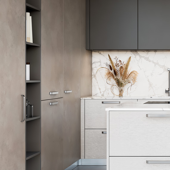 Le mariage du Terra Silex taloché, du Seta blanc strié et de la laque anthracite crée une association de décors raffinée et moderne. Les contrastes de textures et de teintes apportent profondeur et élégance, tout en harmonisant chaque élément pour un rendu à la fois chaleureux et graphique.