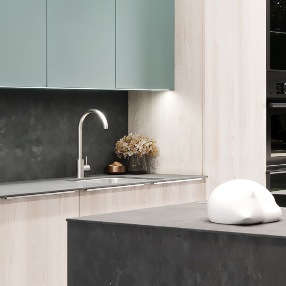 Le mariage du bois clair, du bleu profond et du Terra Quartz crée un contraste élégant et harmonieux. Cette association de décors dynamise l’espace, apporte caractère et personnalité et met en valeur chaque volume de la cuisine.