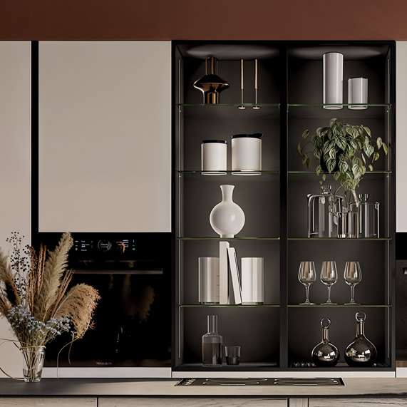 Les niches décoratives centrales, entre les armoires, avec ses étagères en verre transparentes, joue un rôle à la fois pratique et esthétique. Elle met en valeur vos objets décoratifs et apporte lumière, profondeur et modernité à la composition, pour un rendu à la fois élégant et très graphique.